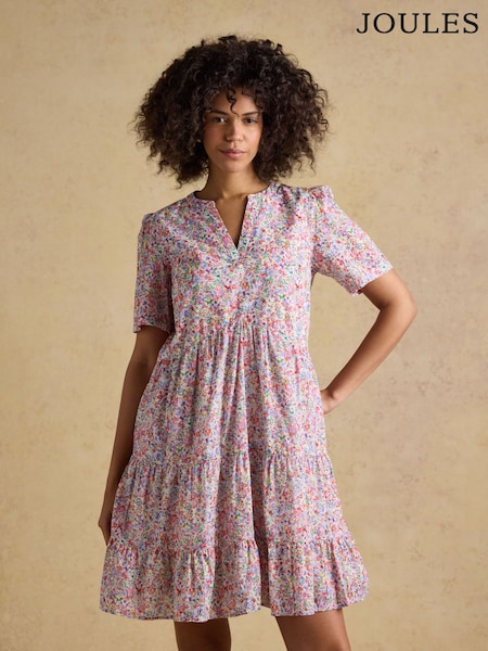 Joules Ariella Pink Ditsy Cotton Tiered Knee Length Dress