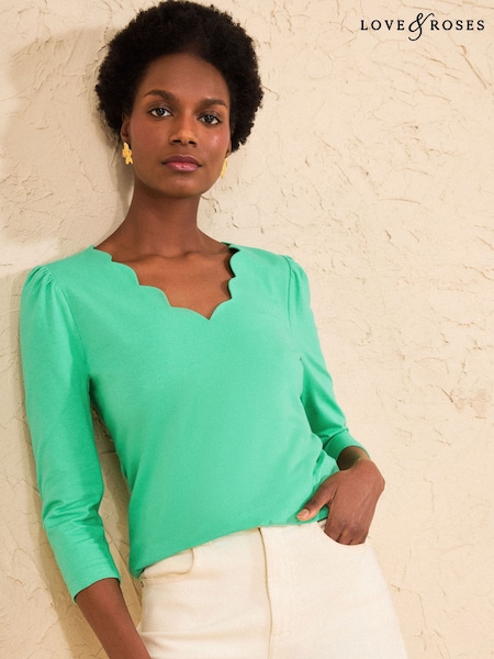 Love & Roses Bright Green 3/4 Sleeve Scallop V-Neck Jersey Top