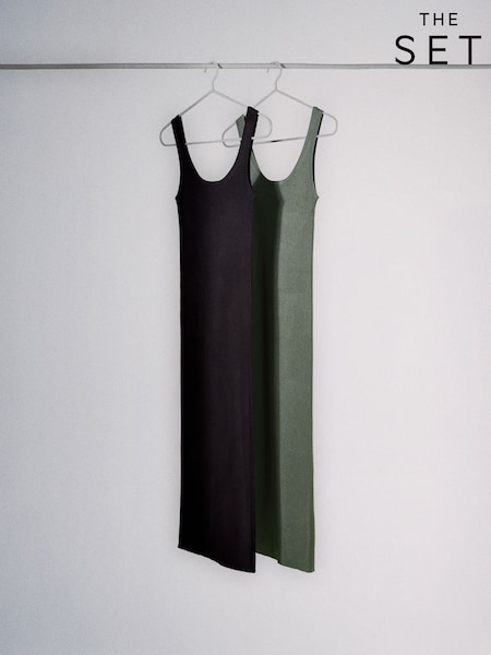 The Set 2 Pack Rib Knit Scoop Neck Coloumn Sleeveless Maxi Dress Khaki Green/Chocolate Brown