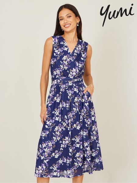 Yumi Blue Blossom Print Mesh Stretch Midi Dress With Pockets