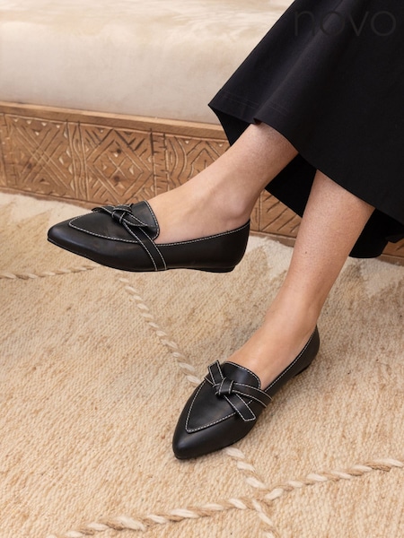 Novo Black Wide Fit Flossy Bow Detail Slip On Flat Loafer Shoes