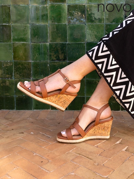 Novo Brown Wide Fit Balmy T-Bar Detail Cork Wedge Sandals
