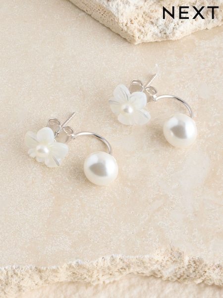 Sterling Silver Floral Pearl Front and Back Earrings