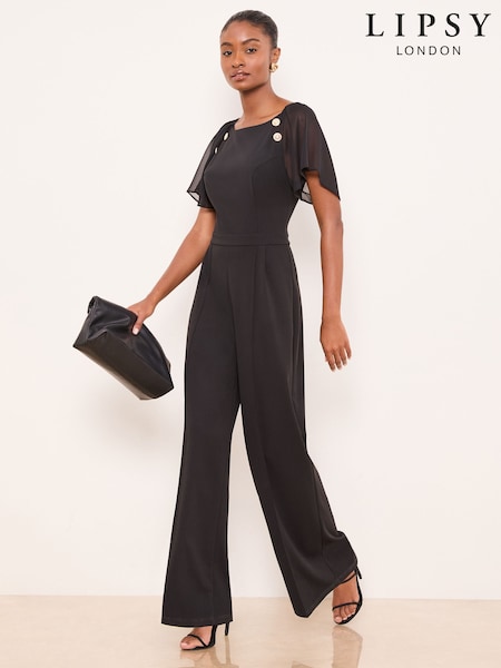 Lipsy Black Petite Chiffon Flutter Sleeve Miltary Button Jumpsuit