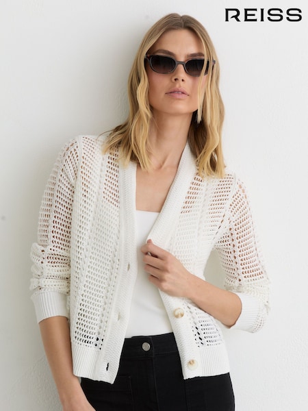 Reiss Ivory Anya V-Neck Short-Sleeve Cardigan Cotton-Wool