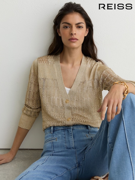 Reiss Gold Milo Metallic Rib-Knit Cardigan