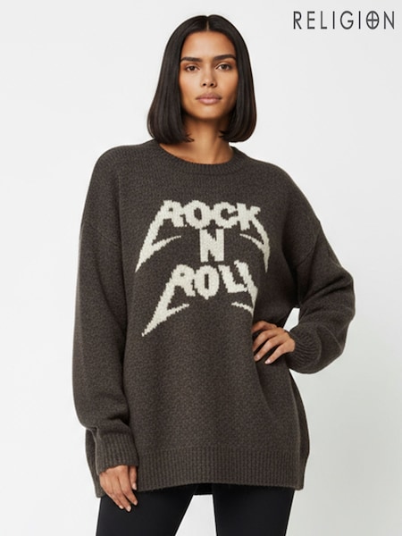 Religion Soft Brown Oversized with Rock N Roll Slogan Jumper