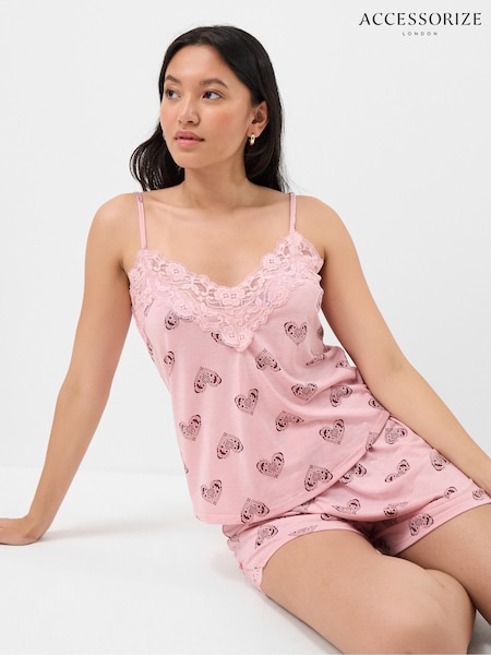 Accessorize Pink Heart Print Lace Trim Short Pyjamas Set