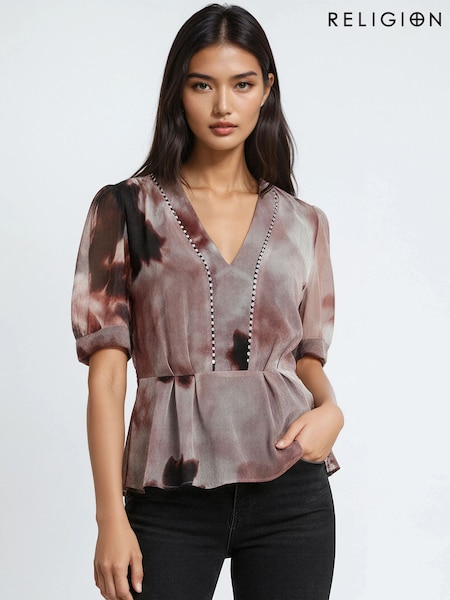 Religion Pink Violet V-Neck Top In Neutral Ocelot Print With Puff Sleeves And Stud Trim
