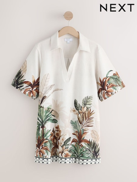 Cream Palm Print Collared Jersey Kaftan