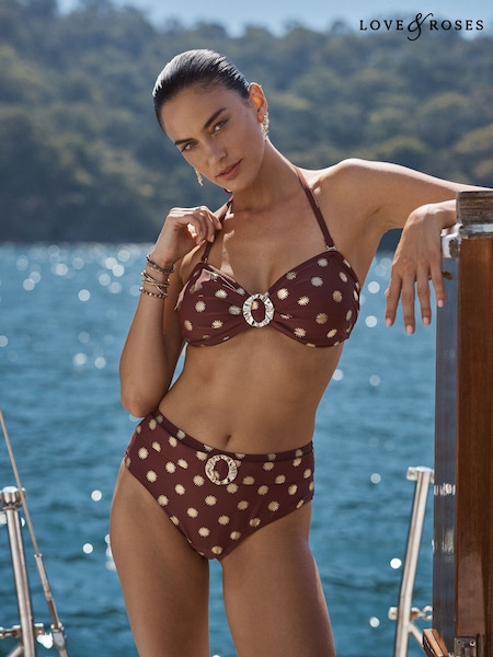 Love & Roses Chocolate Brown Foil High Waisted Tummy Control Belted Bikini Bottoms