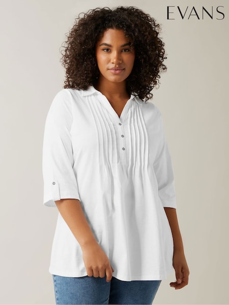 Evans White Pintuck Slub Henley 100% Cotton Top