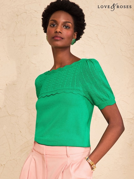 Love & Roses Green Scallop Neck Short Sleeve Knitted Top