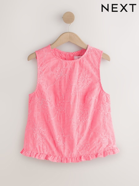 Pink/White Gingham Top With Embroidery