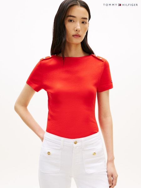 Tommy Hilfiger Red Gold Tone Button Slim Boat Neck T-Shirt