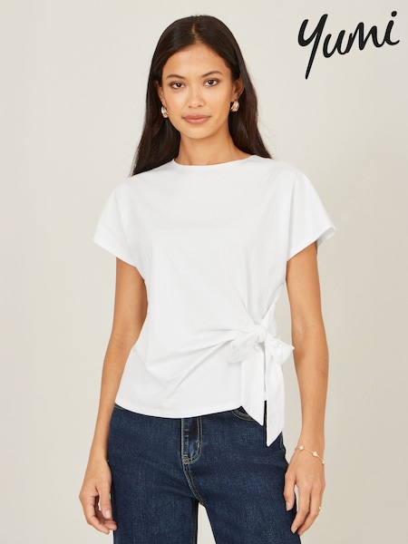 Yumi White Cotton Jersey Top With Knot Detail