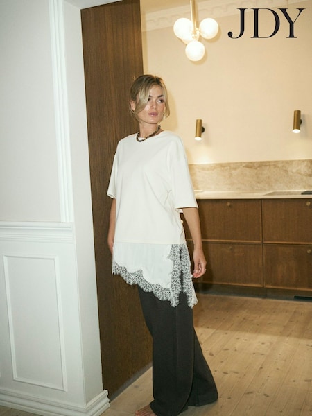 JDY Cream Short Sleeve T-Shirt With Lace Hem