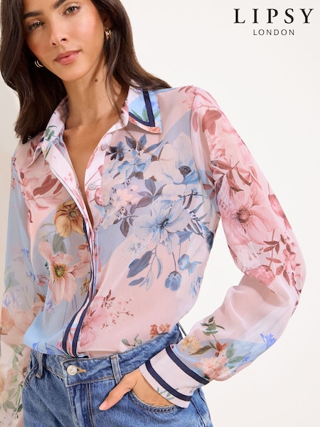 Lipsy Pink Floral Navy Tipped Chiffon Printed Shirt