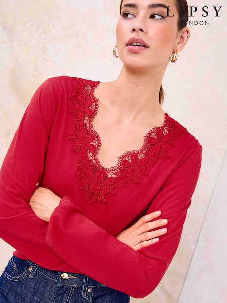 Lipsy Red Lace Detail Long Sleeve Top