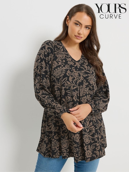 Yours Curve Brown Long Sleeve Pleated Balloon Tunics