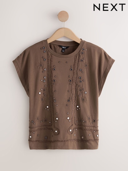 Brown Mirror Embellished Short Sleeve Crew Neck T-Shirt