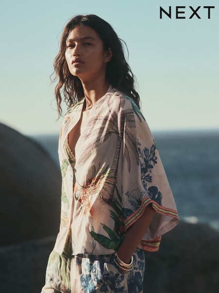 Cream/Navy Embroidered Button Through Top