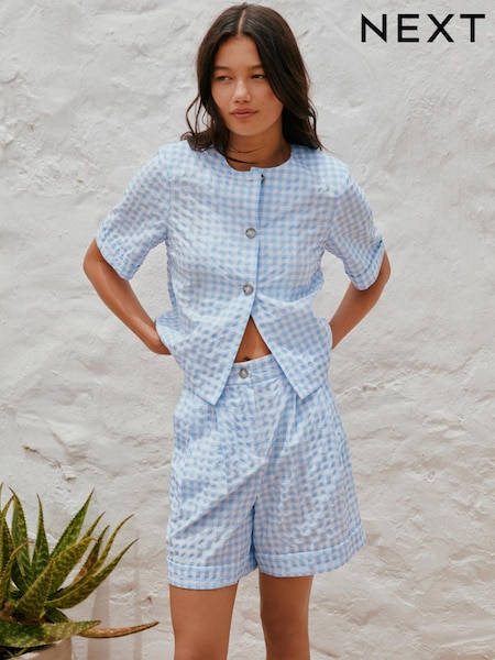 Blue Gingham Short Sleeved Button Through Top