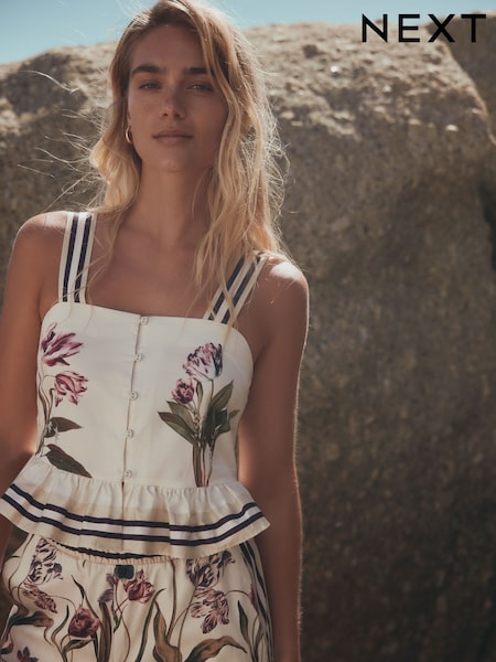 Ecru Floral Print Puff Sleeve Bardot Top With Linen