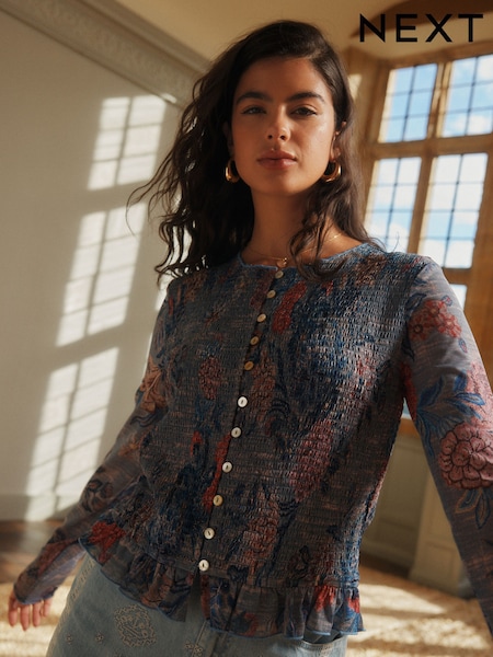Blue Floral Print National Trust x Next Shirred Mesh Long Sleeve Button Through Top