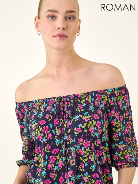 Sosandar Black Geometric Print Sheer Sleeve Bardot Top