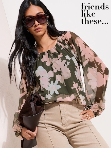 Friends Like These Floral Khaki Long Sleeve Chiffon Tie Neck Blouse