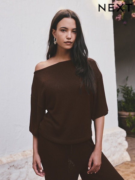 Chocolate Brown Knit Look Asymmetric Short Sleeve Top