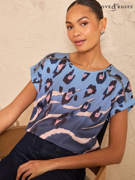 Love & Roses Blue Ombre Animal Print Satin Front Jersey Short Sleeve Top