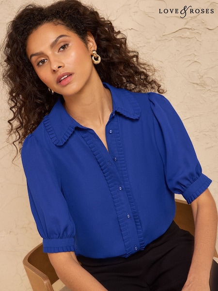 Love & Roses Cobalt Blue Frill Detail Short Sleeve Button Through Shirt