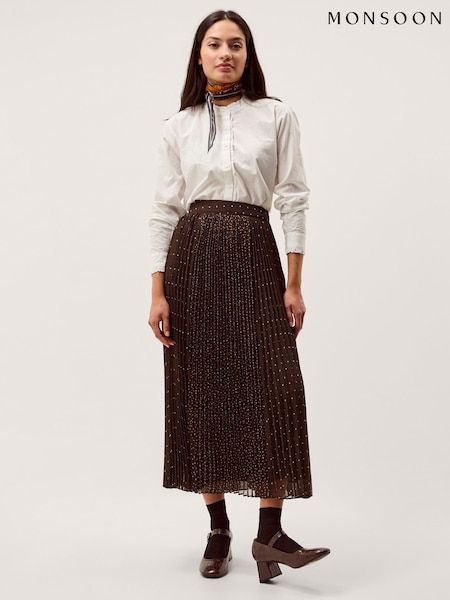 Monsoon Brown Demi Polka Dot Pleated Midi Skirt