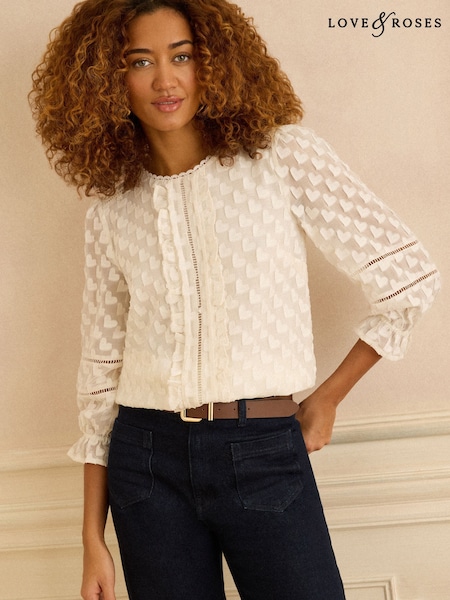 Love & Roses Ivory Petite 3D Heart 3/4 Sleeve Crew Neck Blouse