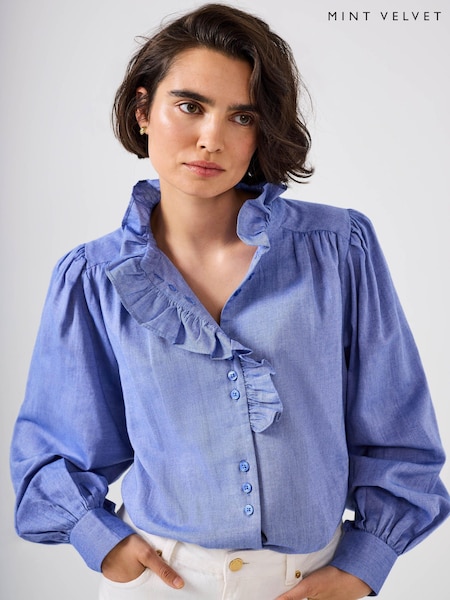 Mint Velvet Blue Cotton Chambray Ruffle Blouse