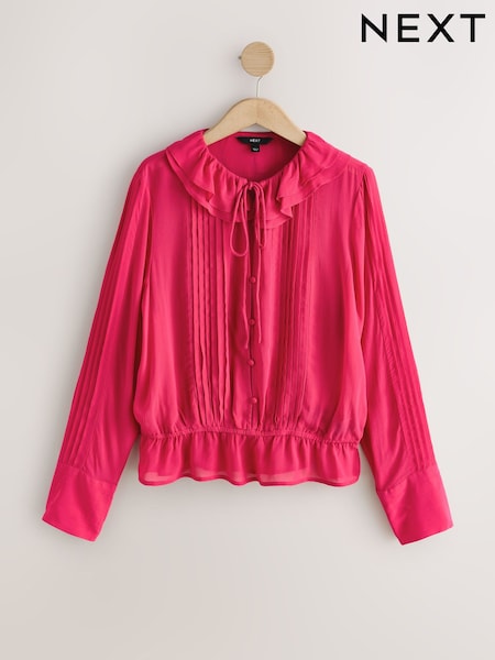 Pink Ruffle Pintuck Long Sleeve Blouse