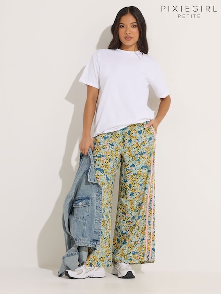 PixieGirl Petite Green Ditsy Wide Leg Side Stripe Trousers