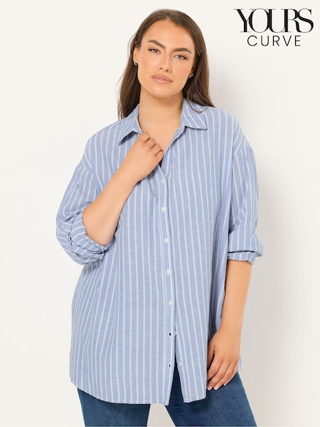 Yours Curve Blue Long Sleeve Linen Blend Striped Shirt
