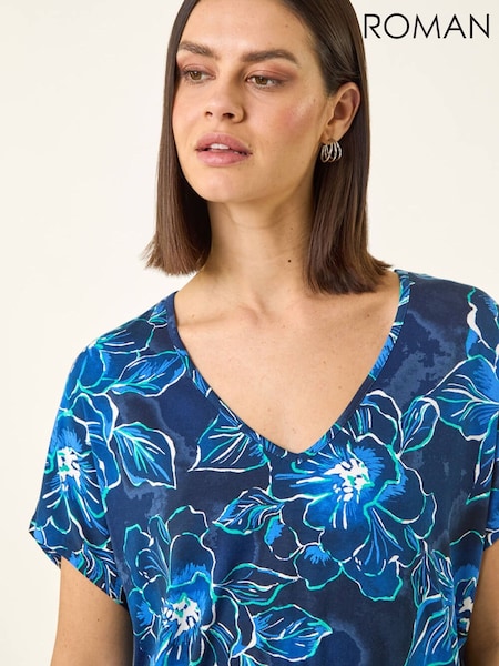 Roman Blue Petite Geo Print V-Neck Stretch Blouse