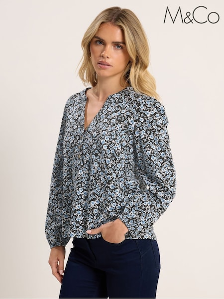 M&Co Blue Petite Half Placket Long Sleeve Printed Jersey Shirt