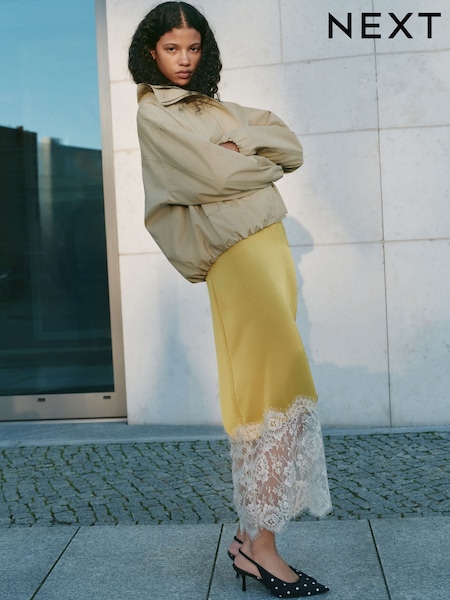 Gold Satin Midi Skirt With Lace Trim