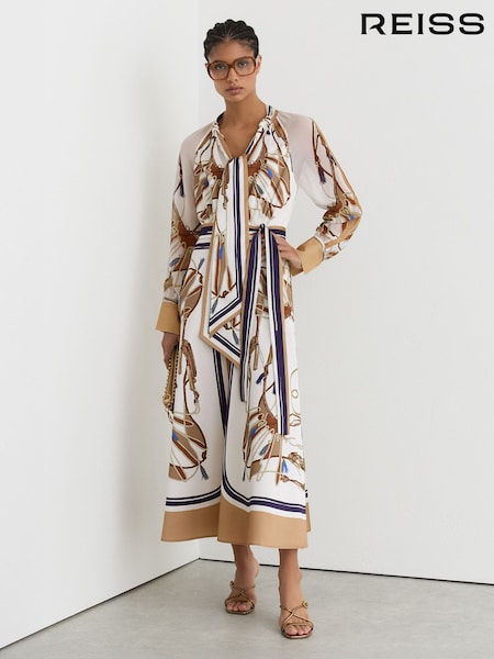 Reiss Ivory/Neutral Ellie Foulard-Print Tie-Neck Midi Dress