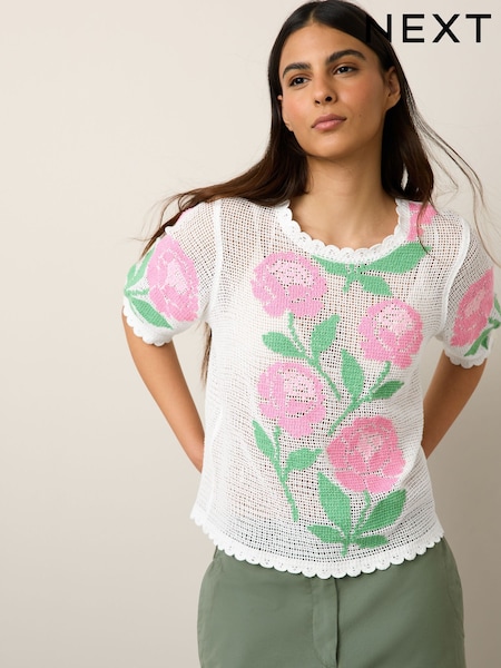 White/Pink Multi Floral Crochet Short Sleeve Crew Neck T-Shirt