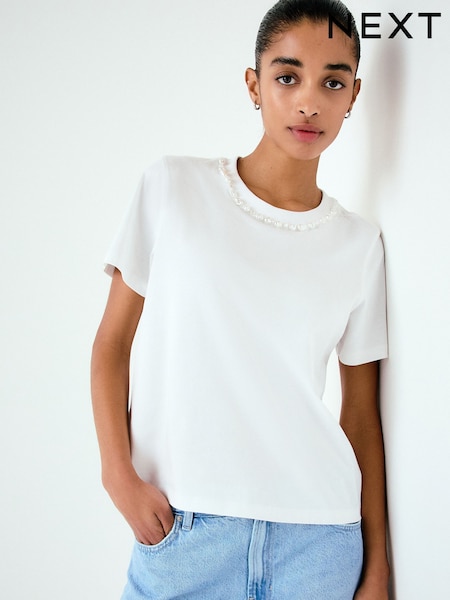 White Embellished Pearl Trim Short Sleeve Crew Neck T-Shirt