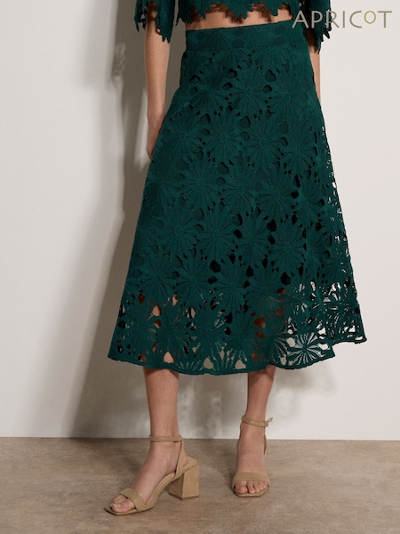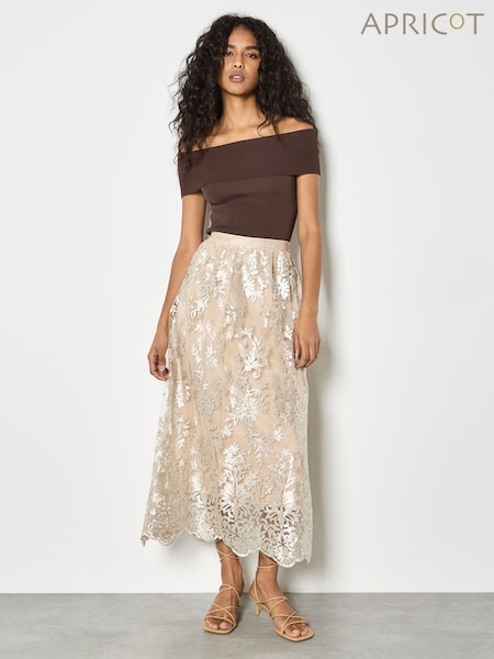 Apricot Blue Embroidered Floral Linen Blend Midaxi Skirt