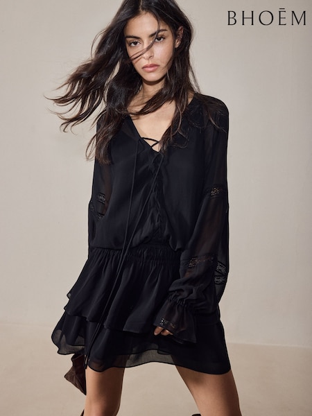 BHOEM Black Frills Mini Dress With Lace-Up Detail