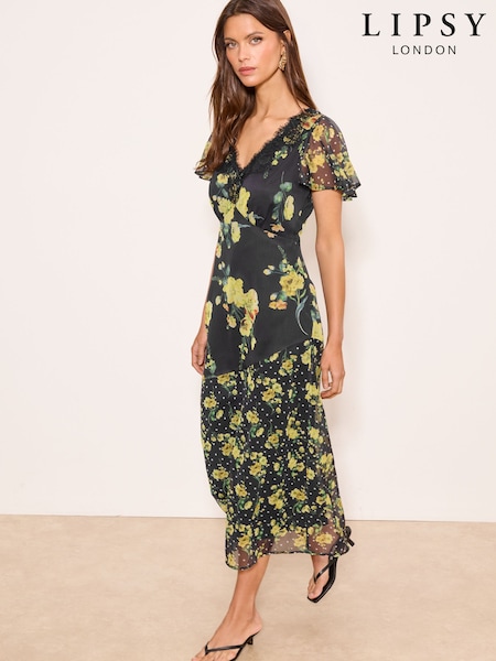 Lipsy Black Petite Floral Lace Insert Wrap Short Sleeve Midi Dress