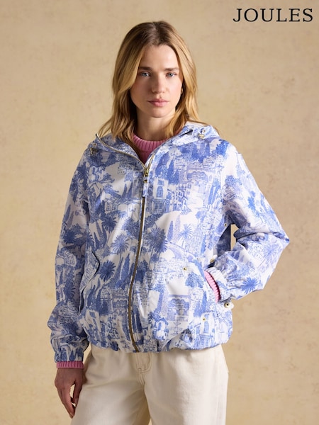 Joules Rainly Cream & Blue Waterproof Packable Raincoat with Hood